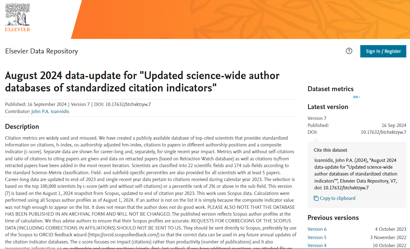 注释:全球2%顶尖科学家榜单基于Scopus数据库的引用数据系统分析,以被引数、H指数、HM因子等6种综合指标,根据“生涯影响力”和“年度影响力”从近700 万名科学家中遴选出世界排名前2%的科学家,分为22个领域和174个细分子领域。在2024年版本中,增加了被撤论文的数据(基于撤稿观察数据库)以及被撤论文的引用/自引用情况。职业生涯数据更新至2023 年底。本版本基于Scopus2024年8月1日数据库,更新至2023年引文年末。